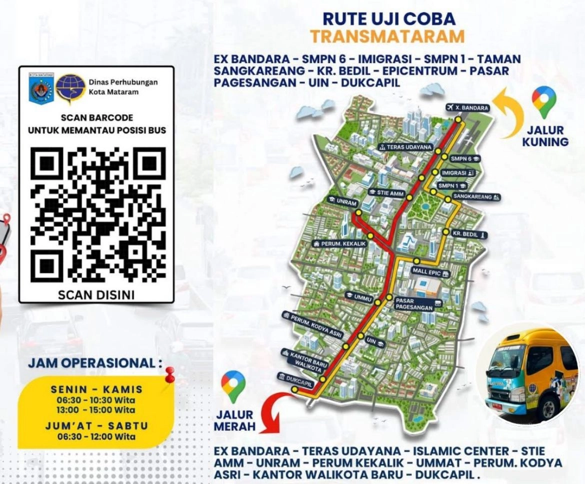 Untuk mempermudah mobilitas, Dishub menyediakan barcode pemantauan bus. Warga cukup memindai kode yang tersedia pada poster maupun kanal informasi Dishub Mataram untuk mengetahui posisi bus secara real time.